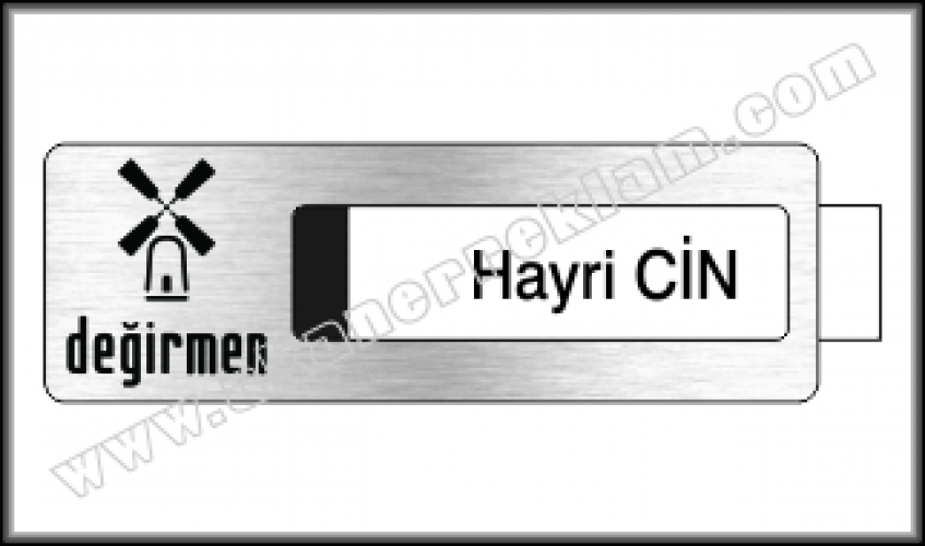 Plastik malzemeden üzerine Renkli Baskılı veya Lazer Kazıma olarak hazırlanan arkasına iğne yada mıknatıs monte edilmek suretiyle kullanılan isimlerin kullanıcı tarafından değiştirilebildiği isimlik çeşididir.