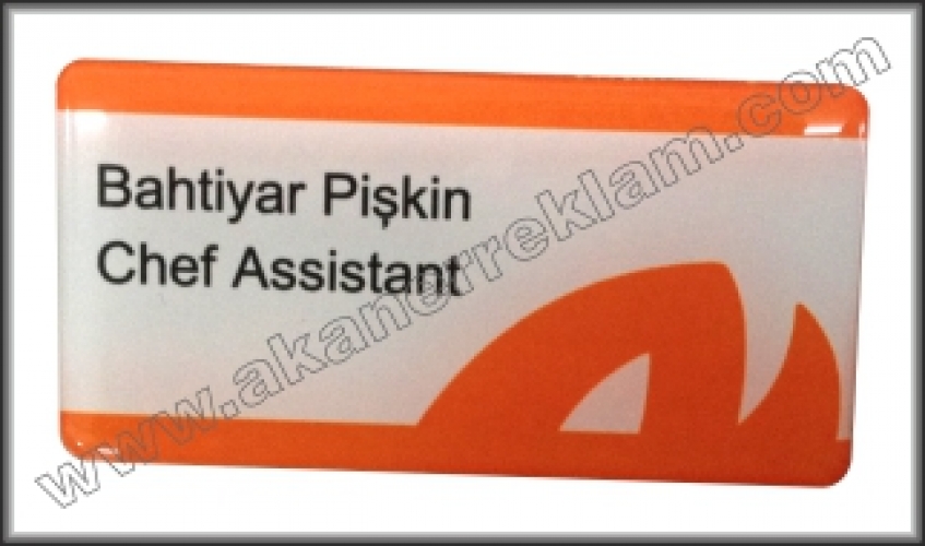 Metal veya Plastik Malzemelerden Renkli Baskılı çalışmaya Damla dökülmek suretiyle hazırlanan İğneli yada Mıknatıslı Yaka İsimlikleridir.