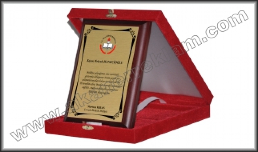 Ahşap kaide üzerine Altın, Gümüş görünümlü metale Renkli Baskı yapılarak Kadife Kutu içerisinde hazırlanan plaket çeşidimizdir.