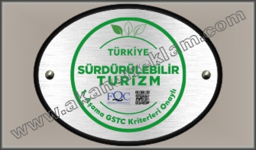 Turizm Bakanlığının belirlediği standartlarda hazırlanan SÜRDÜRÜLEBİLİR TURİZM TABELASI tüm oteller için hazırlanmaktadır. Sipariş için Sertifika Firması tarafından gönderilen QR ( Kare Kodu ) göndermeniz yeterlidir.