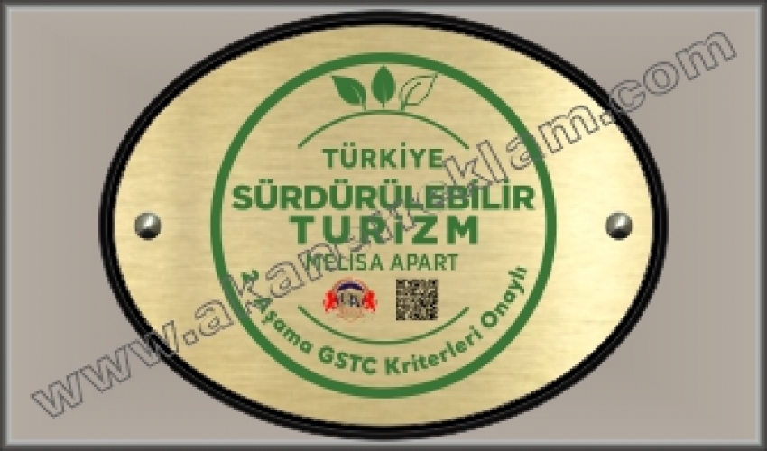 Turizm Bakanlığının belirlediği standartlarda hazırlanan SÜRDÜRÜLEBİLİR TURİZM TABELASI tüm oteller için hazırlanmaktadır. Sipariş için Sertifika Firması tarafından gönderilen QR ( Kare Kodu ) göndermeniz yeterlidir.