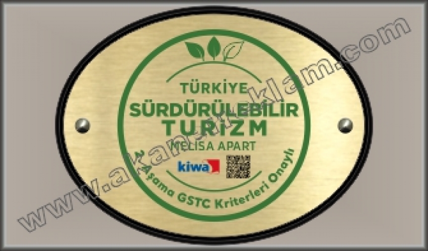 Turizm Bakanlığının belirlediği standartlarda hazırlanan SÜRDÜRÜLEBİLİR TURİZM TABELASI tüm oteller için hazırlanmaktadır. Sipariş için Sertifika Firması tarafından gönderilen QR ( Kare Kodu ) göndermeniz yeterlidir.