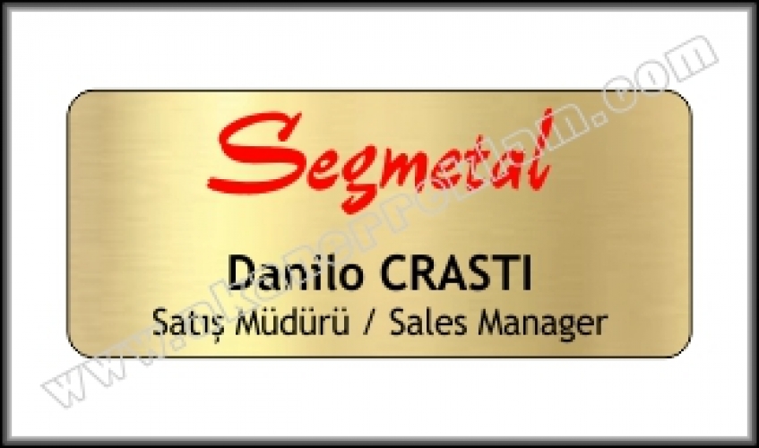 Metal Yaka İsimlikleri alt kategorisinde yer alan parlak altın görünümlü metal üzerine renkli baskılı olarak hazırlanan yaka isimliğdir. Arkasına iğne yada mıknatıs monte edilmek suretiyle kullanılan isimlik çeşididir. İstenilen ölçüde hazırlanabilir. Metal Yaka İsimlikleri yüksek adetli siparişlerinizde özel kesimli olarak da imal edilebilir.