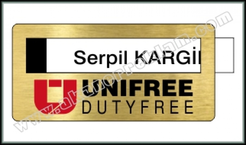 Metal Yaka İsimlikleri alt kategorisinde yer alan fırçalı altın görünümlü metal üzerine renkli baskılı olarak hazırlanan isim değişikliği yapabildiğiniz yaka isimliği modelidir. Arkasına iğne yada mıknatıs monte edilmek suretiyle kullanılmaktadır. Standart ebatları bulunmaktadır. Metal Yaka İsimlikleri yüksek adetli siparişlerinizde özel kesimli olarak da imal edilebilir. Personel değişiminin fazla olduğu işletmelerin tercih ettiği yaka isimliği modelidir.