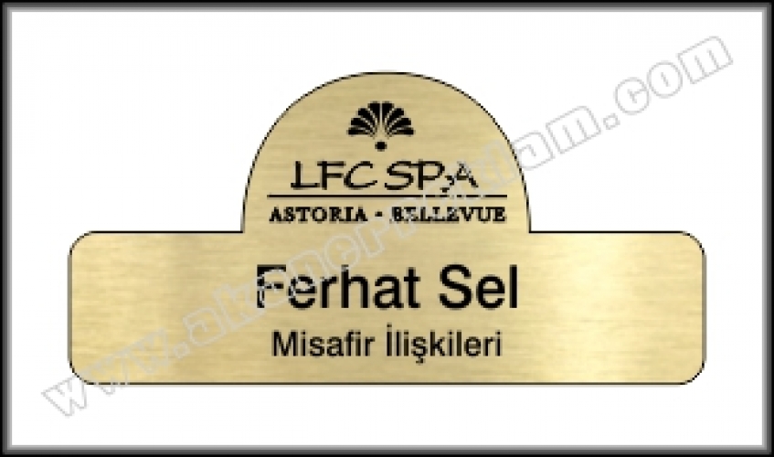 Plastik Yaka İsimlikleri alt kategorisinde yer alan fırçalı altın metal görünümlü özel plastik malzemeden üzerine renkli baskılı olarak hazırlanan iyaka isimliği modelidir. Malzeme yapı ititbariyle özel kesime uygundur. Bu nedenle az adetli siparişlerinizde de özel kesimli yaka isimliği hazırlanabilmektedir. Arkasına iğne yada mıknatıs monte edilmek suretiyle kullanılmaktadır.